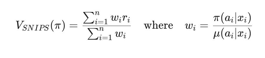 Self-Normalized Importance Sampling (SNIPS): This method re-weights the observed rewards from the test log based on how likely our new policy was to make the same choice compared to the original logging policy. The formula is:
