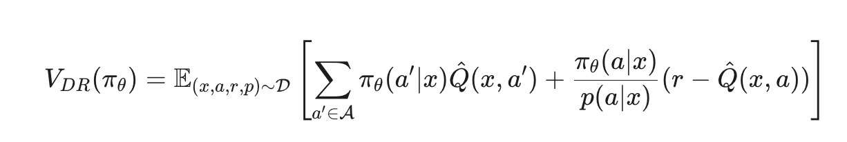 By combining them, the DR estimator remains unbiased if either the reward model Q^ or the propensity score p(a∣x) is correct, making it very robust. We train our policy to maximize this value.