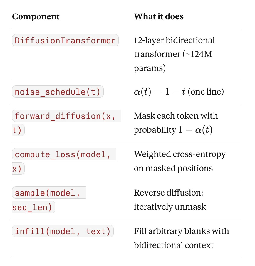 This post follows the path from that question to a working answer. We trace the key ideas and arrive at a revelation: the correct discrete analog of Gaussian noise is masking, and BERT has been a diffusion model since 2018. Then we build the whole thing from scratch in PyTorch and train it on OpenWebText.
