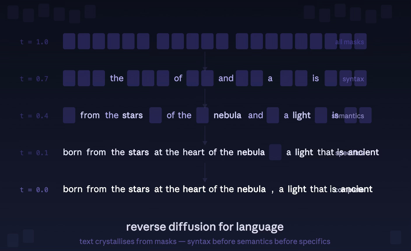 Text crystallises the same way images denoise: structure first (function words, syntax), then content (nouns, verbs, topics), then specifics (names, numbers, rare words).