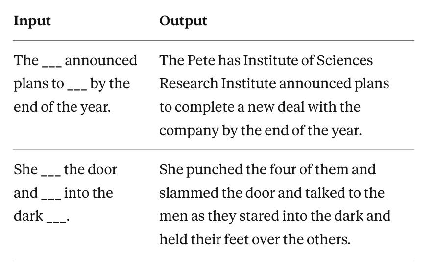 The fills are imperfect, the model is undertrained and some outputs are incoherent, but the mechanism is clearly working. The second example is genuinely compelling: “punched,” “slammed,” “stared into the dark” create a coherent narrative with consistent tone, conditioned on both the left context (”She”) and the right context (”the door,” “into the dark”). An autoregressive model would have to generate left-to-right and could not condition on “into the dark” when choosing “punched.”