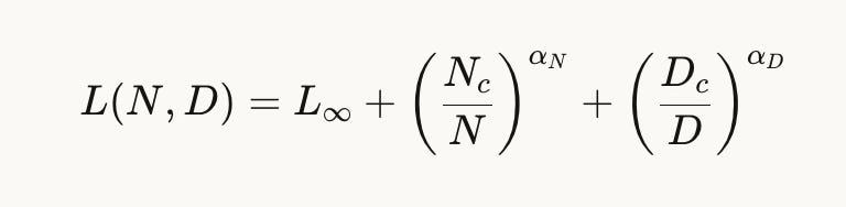 The fitted exponents (αN ≈ 0.703, αD ≈ 0.188) show that both model size and data size matter, and gains require scaling both together.