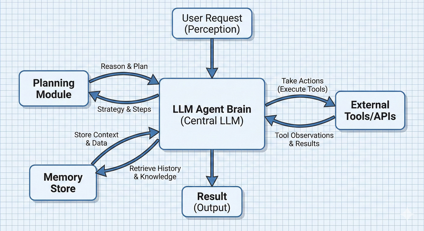 Large Language Model-based agents represent a fundamental paradigm shift from static text generation to autonomous, goal-directed systems capable of environmental interaction and multi-step reasoning. An LLM by itself is essentially a textual oracle: it takes a prompt and generates a completion. It cannot perform real actions in the world or fetch new information once trained – its world begins and ends with the text in its prompt context. An LLM-based agent wraps an LLM inside an execution loop: observe → decide → act → observe. The LLM proposes the next action (often a tool call), the system executes it in an environment (web, Python REPL, IDE, enterprise APIs), and the resulting observation is fed back into the LLM. Over multiple steps, the agent can gather information, run computations, recover from errors, and converge on a final outcome rather than betting everything on a single response.